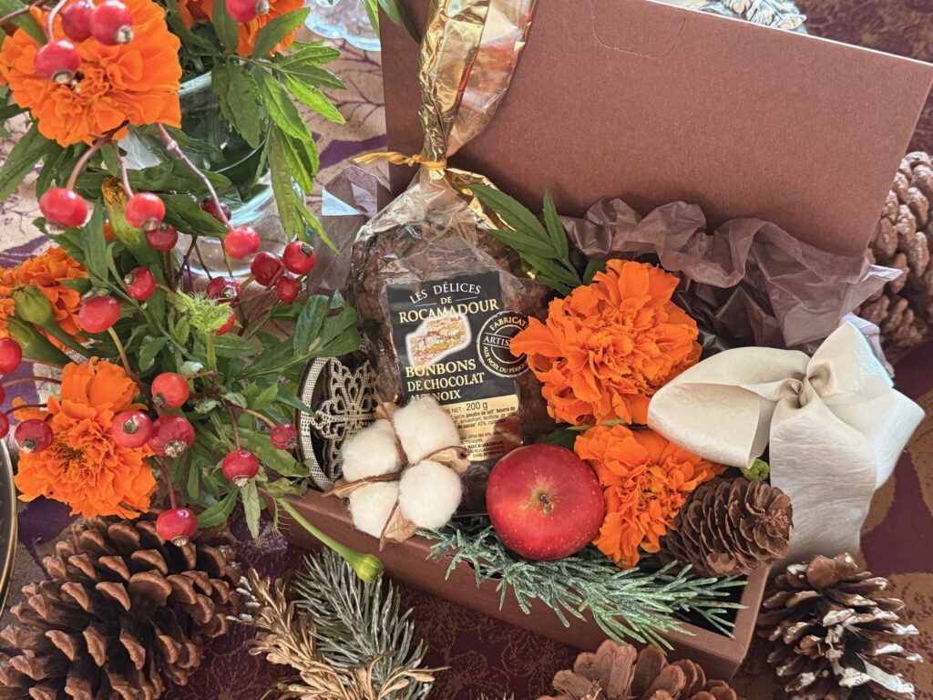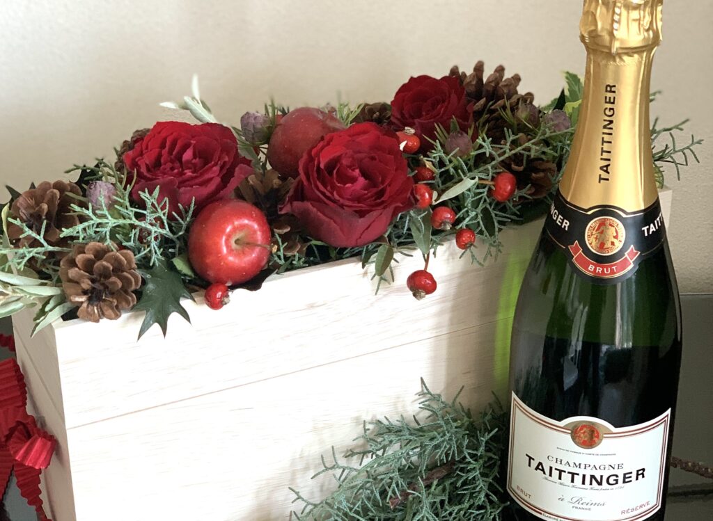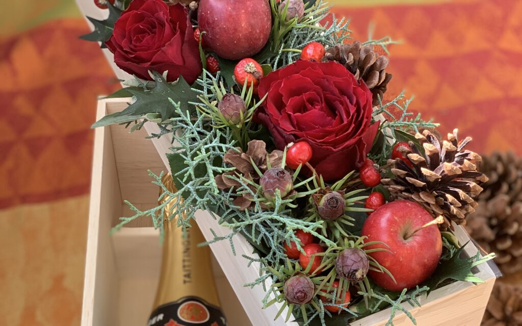 私は毎年、クリスマスが近づくとシャンパーニュとお花を組み合わせたクリスマスギフトを贈っているのですが、今年は11月に訪れたフランス・バスク地方でお土産に買ったバスクチョコレートを、せっかくならと箱に入れ、お花を添えてクリスマスプレゼントに仕立てました。