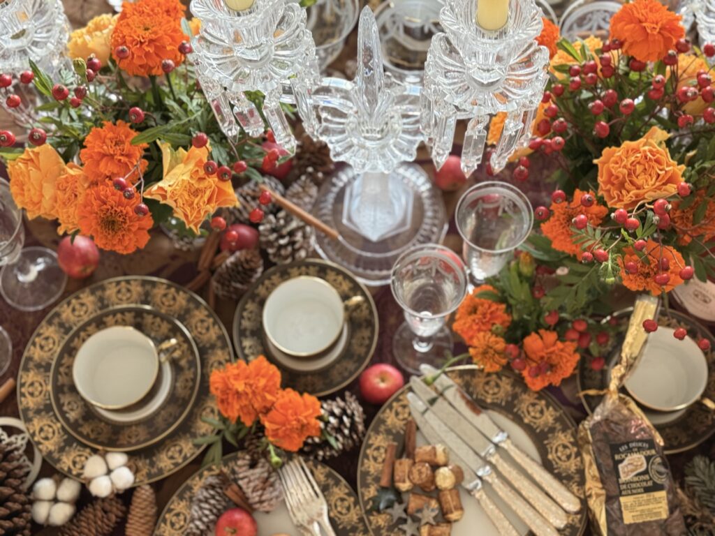今年のクリスマスパーティーでは、パリで購入したオレンジ色のリネンに合わせ、オレンジ・赤・茶色・ゴールドを基調にした花と一緒にテーブルコーディネートをする予定!